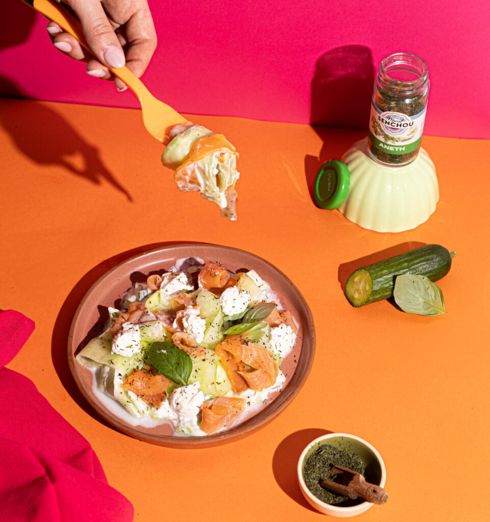 4. Saupoudre d’aneth et tu peux même rajouter une feuille de menthe ou de basilic pour encore plus de fraicheur.